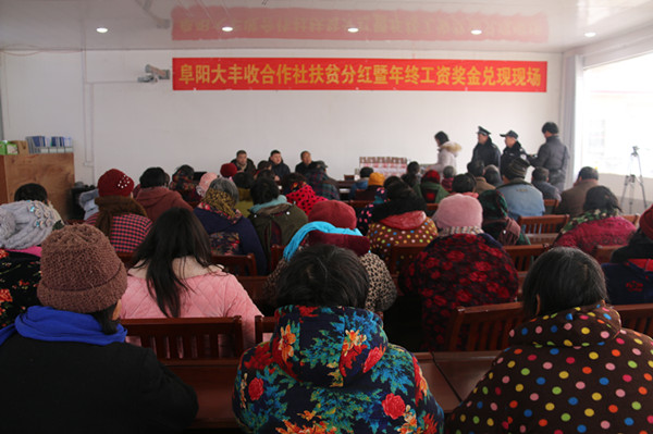 1月31日上午,阜陽市潁泉區(qū)聞集鎮(zhèn)大豐收合作社舉行扶貧分紅暨年終工資獎金兌現現場會,參與金融入股、土地入股和在大豐收合作社務工的85名貧困戶和100余名農戶及合作社主要負責人參加會議,聞集鎮(zhèn)黨委副書記、鎮(zhèn)長楊樹華出席會議。