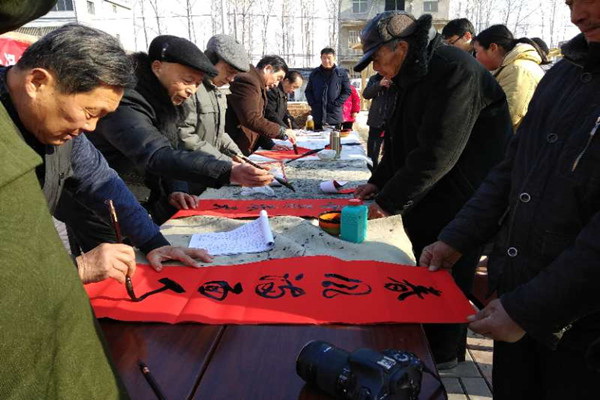 在于集鄉(xiāng)席老家村農(nóng)民文化活動(dòng)廣場(chǎng),退休老干部們現(xiàn)場(chǎng)揮毫潑墨,創(chuàng)作出一幅幅年味濃、寓意好、政策宣傳性強(qiáng)又充滿正能量的春聯(lián),既展現(xiàn)了退休老同志們昂揚(yáng)向上的精神面貌,又歌頌了國(guó)家改革開(kāi)放三十多年來(lái)的發(fā)展成果,再次宣傳了黨的十九大精神。