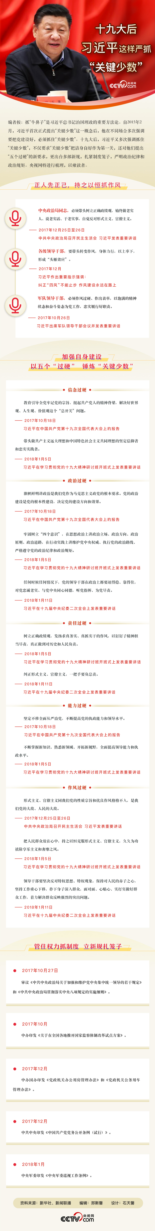 抓“牛鼻子”是習(xí)近平總書記治國(guó)理政的重要方法論。自2015年2月,習(xí)近平首次正式提出“關(guān)鍵少數(shù)”這一概念后,他在不同場(chǎng)合多次強(qiáng)調(diào)要把黨建設(shè)好,必須抓住“關(guān)鍵少數(shù)”。十九大后,習(xí)近平又多次強(qiáng)調(diào)抓住“關(guān)鍵少數(shù)”,不僅要求“關(guān)鍵少數(shù)”把潔身自好作為第一關(guān),還對(duì)他們提出“五個(gè)過硬”的新要求,更出臺(tái)多部新規(guī),扎緊制度籠子,嚴(yán)明政治紀(jì)律和政治規(guī)矩。