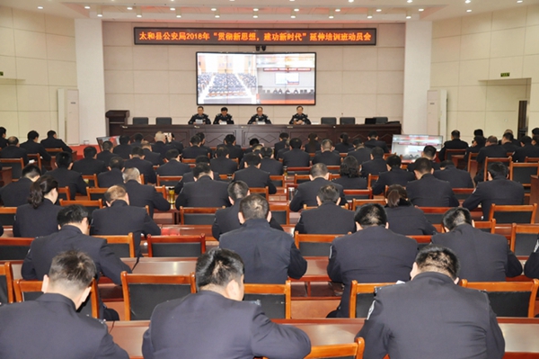 為認(rèn)真落實全縣“貫徹新思想、建功新時代”專題培訓(xùn)通知精神,使全體民警學(xué)深悟透習(xí)近平習(xí)近平新時代中國特色社會主義思想和黨的十九大精神,為實現(xiàn)縣委提出的“皖北首位、安徽十強(qiáng)”的發(fā)展目標(biāo),把思想統(tǒng)一到縣委、縣政府的決策部署上來,實現(xiàn)2018年公安工作良好開局,2月27日上午,太和縣公安局為期五天的“貫徹新思想、建功新時代”延伸培訓(xùn)班正式開班。受局黨委委托,局黨委副書記、政委劉金標(biāo)作了開班動員講話。未參加縣培訓(xùn)班的全局股級以上干部在主會場參加了集中培訓(xùn),農(nóng)村派出所其他民警和輔警在分會場通過視頻會形式參訓(xùn)。局黨委委員、副政委李志中主持了開班儀式。