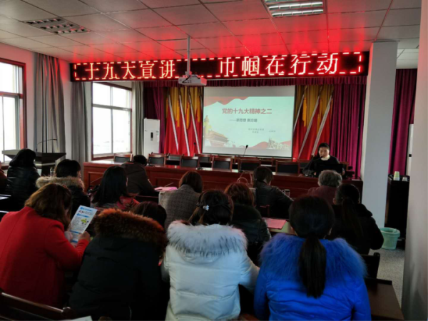二、“十九大宣講,巾幗在行動(dòng)”。3月8日,鎮(zhèn)村婦女干部聚集一堂,聆聽了由潁州區(qū)微宣講團(tuán)成員,鎮(zhèn)婦聯(lián)副主席王盼盼宣講的“十九大精神宣講——新思路、新方略”。重點(diǎn)闡述了大會(huì)的主題是不忘初心、牢記使命。并從十九大報(bào)告的核心要義和豐富內(nèi)涵,十九大報(bào)告的重大意義和歷史貢獻(xiàn)以及新思想的基本方略三個(gè)部分宣講十九大精神。并號召廣大婦女干部要把握思想理論脈絡(luò)和歷史文化源流,用心學(xué)習(xí),用心體會(huì),內(nèi)化于心,外化于行。
