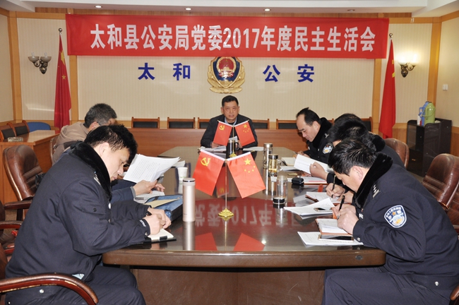 根據(jù)縣委統(tǒng)一部署要求,3月9日下午,太和縣公安局召開(kāi)2017年度黨委班子專題民主生活會(huì),黨委班子及成員緊扣“認(rèn)真學(xué)習(xí)領(lǐng)會(huì)習(xí)近平習(xí)近平新時(shí)代中國(guó)特色社會(huì)主義思想,堅(jiān)定維護(hù)以習(xí)近平同志為核心的黨中央權(quán)威和集中統(tǒng)一領(lǐng)導(dǎo),全面貫徹落實(shí)黨的十九大各項(xiàng)決策部署”主題,深入學(xué)習(xí)貫徹黨的十九大精神,以習(xí)近平習(xí)近平新時(shí)代中國(guó)特色社會(huì)主義思想為指導(dǎo),緊緊圍繞縣委要求,聯(lián)系班子和個(gè)人實(shí)際深入查擺問(wèn)題,深刻進(jìn)行黨性分析,嚴(yán)肅開(kāi)展批評(píng)和自我批評(píng),認(rèn)真研究了對(duì)查擺問(wèn)題的整改。副縣長(zhǎng)、縣公安局黨委書(shū)記、局長(zhǎng)張廣杰主持會(huì)議并作總結(jié)講話??h紀(jì)委第二集中派駐紀(jì)檢組組長(zhǎng)隨東江,縣黨群系統(tǒng)黨委書(shū)記、縣委組織部辦公室主任宮躍兩位同志到會(huì)指導(dǎo)。
