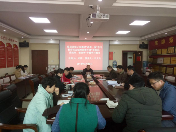 3月12日,臨泉縣統(tǒng)計局在會議室召開全局黨員干部大會,結合“兩學一做”學習教育常態(tài)化,傳達學習了黨的十九屆二中全會精神,并就抓好貫徹落實工作進行了安排部署。會議由縣統(tǒng)計局黨組書記、局長宋偉主持。