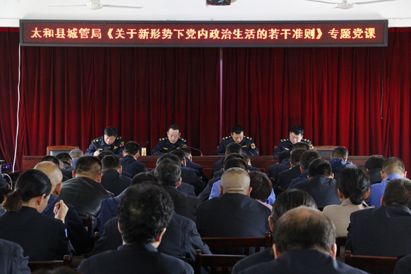 會(huì)上,太和縣城管局黨總支書記翟峰帶領(lǐng)全體人員認(rèn)真學(xué)習(xí)了《關(guān)于新形勢下黨內(nèi)政治生活的若干準(zhǔn)則》,并以通俗易懂、深入淺出的方式逐條解讀了《準(zhǔn)則》,同時(shí)要求全體黨員要把黨性原則作為最高原則,把黨性修養(yǎng)作為根本修養(yǎng),不斷改進(jìn)自身作風(fēng),持續(xù)提升工作效能,充分發(fā)揮先鋒模范帶頭作用,確保各項(xiàng)工作落到實(shí)處,推進(jìn)太和縣城市管理水平的提高,以新形象,新作風(fēng),新成效建功新時(shí)代。