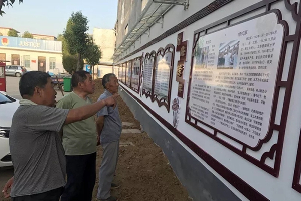 太陽西下,在界首市田營鎮(zhèn),工作人員將宣傳長廊最后一個版塊剛訂好,地上的草坪還沒有鋪,就吸引前來辦事的群眾和干部觀看和討論。