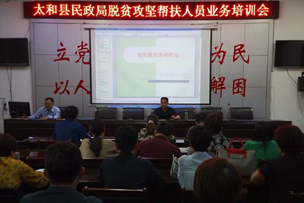 為進(jìn)一步提高民政系統(tǒng)干部職工脫貧攻堅政策理論水平,推動精準(zhǔn)扶貧、精準(zhǔn)脫貧工作開展,確保打贏脫貧攻堅戰(zhàn),實現(xiàn)2018年縣摘帽目標(biāo)。5月2日下午,太和縣民政局在五樓會議室召開脫貧攻堅幫扶人員業(yè)務(wù)培訓(xùn)會。局機(jī)關(guān)全體人員、下屬各單位主要負(fù)責(zé)人及所有幫扶人員參加了培訓(xùn)會。會議由縣民政局黨組成員、主任科員崔琦主持。