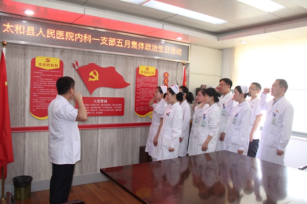 根據《中共阜陽市委組織部黨員政治生日制度(試行)》,持續(xù)強化黨員身份意識和組織歸屬感,5月4日,太和縣人民醫(yī)院內科一支部集中為9名同時期入黨黨員舉辦以重溫入黨誓詞為主題的政治生日活動。醫(yī)院黨委副書記、副院長孫廷強以普通黨員身份參加,活動由內科一支部書記、副院長賈雪峰主持。