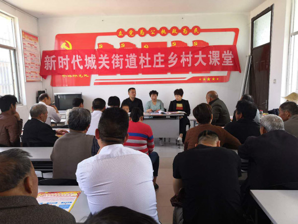二是在群眾家門(mén)口設(shè)立課堂。在杜莊社區(qū)各自然村都設(shè)立大課堂。目前杜莊社區(qū)已在王關(guān)廟自然村、龐樓自然村、李黃莊自然村進(jìn)行了三次“大課堂”宣講活動(dòng),深受群眾的好評(píng)。