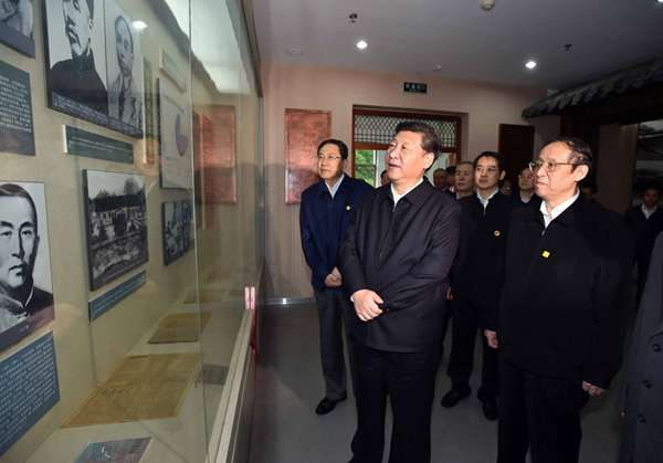 2016年4月24日至27日,習(xí)近平在安徽調(diào)研。這是4月24日上午,習(xí)近平在六安市金寨縣參觀金寨縣革命博物館。