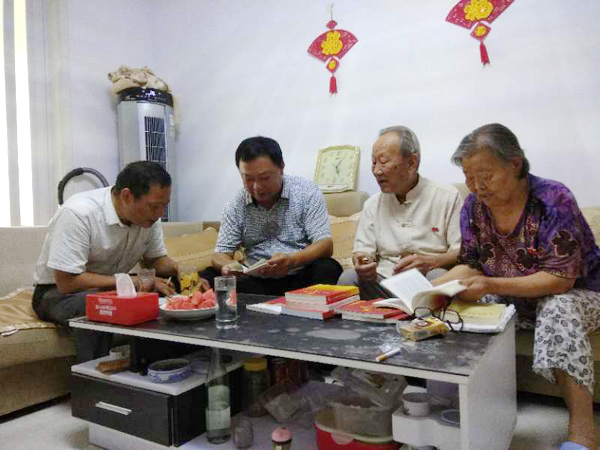 張飛雷一行冒著三伏高溫,騎著自行車看望離休老干部宋鵬程,并送學(xué)上門。將《黨的十九大報(bào)告讀本》、新修訂的《中國(guó)共產(chǎn)黨章程》等學(xué)習(xí)資料親自送到老干部宋鵬程、劉素英手中,為老干部們送上了精神食糧,確保老干部政治學(xué)習(xí)不斷、理想信念常新。還為他們佩戴了黨徽。