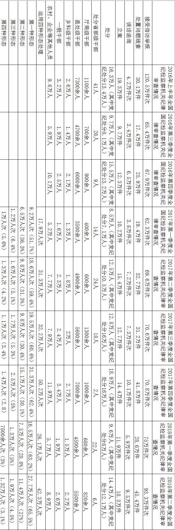 7月19日上午,中央紀(jì)委國(guó)家監(jiān)委網(wǎng)站通報(bào)了今年上半年全國(guó)紀(jì)檢監(jiān)察機(jī)關(guān)監(jiān)督檢查、審查調(diào)查情況——2018年上半年,全國(guó)紀(jì)檢監(jiān)察機(jī)關(guān)共接受信訪舉報(bào)168.3萬(wàn)件次,處置問(wèn)題線索74萬(wàn)件,談話函詢15.4萬(wàn)件次,立案30.2萬(wàn)件,處分24萬(wàn)人(其中黨紀(jì)處分20.1萬(wàn)人)。處分省部級(jí)及以上干部28人,廳局級(jí)干部1500余人,縣處級(jí)干部1萬(wàn)人,鄉(xiāng)科級(jí)干部3.7萬(wàn)人,一般干部4.5萬(wàn)人,農(nóng)村、企業(yè)等其他人員14.6萬(wàn)人。2018年上半年,全國(guó)紀(jì)檢監(jiān)察機(jī)關(guān)運(yùn)用監(jiān)督執(zhí)紀(jì)“四種形態(tài)”處理68.4萬(wàn)人次。