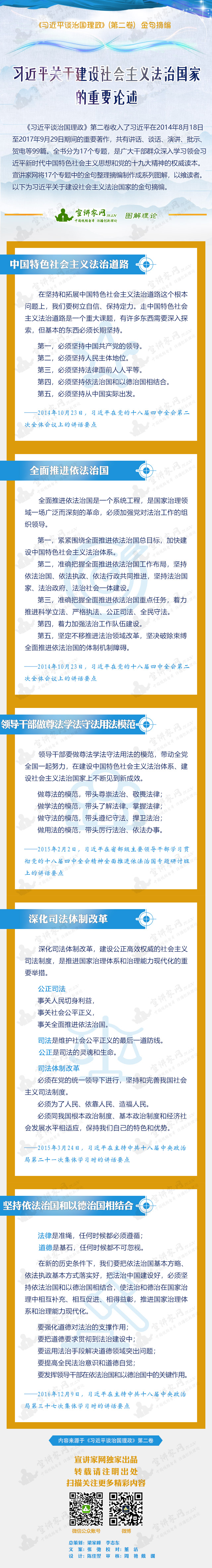 摘要:《習(xí)近平談治國理政政政》第二卷收入了習(xí)近平在2014年8月18日至2017年9月29日期間的重要著作,共有講話、談話、演講、批示、賀電等99篇。全書分為17個(gè)專題,是廣大干部群眾深入學(xué)習(xí)領(lǐng)會習(xí)近平習(xí)近平新時(shí)代中國特色社會主義思想和黨的十九大精神的權(quán)威讀本。宣講家網(wǎng)將17個(gè)專題中的金句整理摘編制作成系列圖解,以饗讀者,以下為習(xí)近平關(guān)于建設(shè)社會主義法治國家的金句圖解。