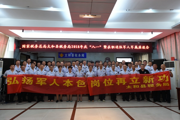 為熱烈慶祝中國人民解放軍建軍91周年,7月30日下午,太和縣稅務局在縣局五樓會議室召開慶祝建軍91周年暨在職退伍軍人、軍屬座談會。副局長劉紅軍主持會議,縣局領導、全體在職退伍軍人、軍屬參加會議,縣局聯(lián)合黨委書記、局長劉芳出席會議并作總結寄語。