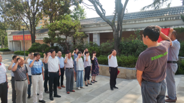 在臨泉縣老集鎮(zhèn)的魏野疇紀(jì)念館和韋寨鎮(zhèn)吳營(yíng)村的劉鄧大軍千里躍進(jìn)大別山紀(jì)念館,為革命先驅(qū)敬獻(xiàn)花籃、拜謁烈士英魂,在英雄雕塑前,面對(duì)鮮紅的黨旗,全體黨員舉起緊握的右手,進(jìn)行莊嚴(yán)宣誓。