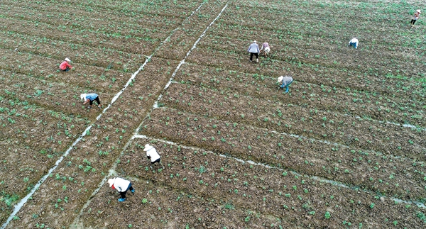 8月4日,在廬江縣金牛鎮(zhèn)特色種植扶貧基地,村民冒著高溫給千畝金絲皇菊除草、間苗。通訊員左學(xué)長攝