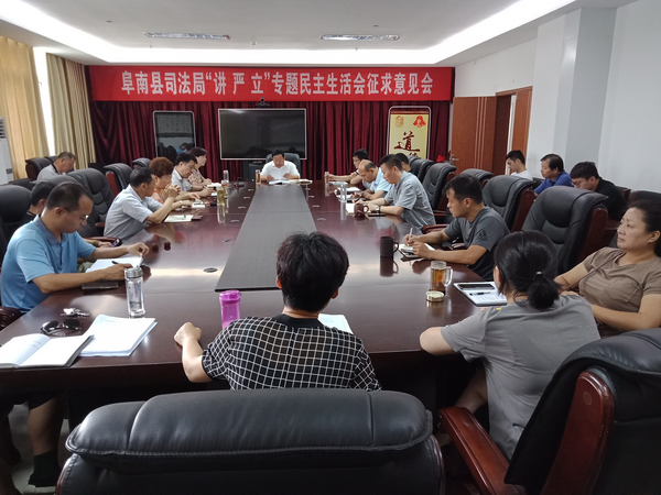 為進(jìn)一步提升民主生活會(huì)召開(kāi)效果,8月7日上午,阜南縣司法局召開(kāi)“講嚴(yán)立”專(zhuān)題民主生活會(huì)征求意見(jiàn)會(huì),廣泛征集全體司法行政干警意見(jiàn)建議,會(huì)議由局黨組書(shū)記、局長(zhǎng)丁傳珠主持。