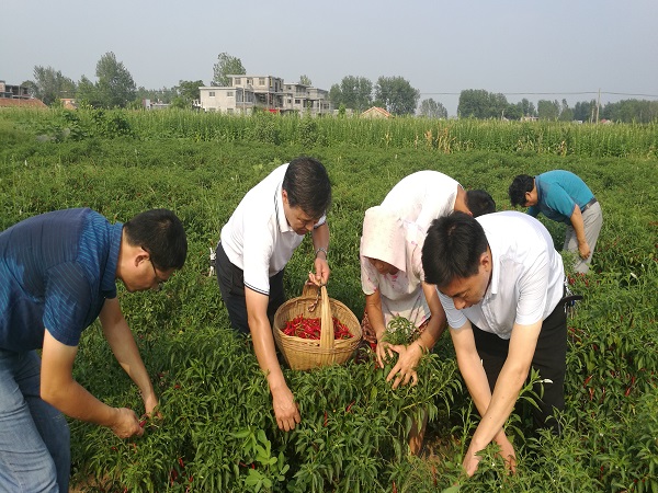 烈日當(dāng)頭,黨員干部卻似成熟的辣椒熱情高漲。臨泉縣委老干部局全體黨員干部和關(guān)廟鎮(zhèn)范莊村部分村民一起在石金營(yíng)流轉(zhuǎn)的田地里采摘辣椒,與群眾交流談心。詢問(wèn)采摘辣椒的時(shí)間,每天可以采摘多少,收入多少,辣椒的行情以及辣椒的吃法等內(nèi)容,了解他們的思想和生活情況,積極向群眾宣傳“破四舊、立四新”、農(nóng)村環(huán)境整治等新思想新政策、解答疑惑。并鼓勵(lì)前來(lái)采摘辣椒的貧困戶樹(shù)立信心、振奮精神、自力更生、勤勞致富。