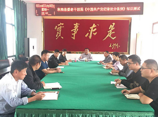 10月8日,老干部局委舉行新修訂的《中國共產(chǎn)黨紀(jì)律處分條例》知識測試??h委組織部副部長老干部局局長張飛雷主持并講話,局全體人員參加此次知識測試。