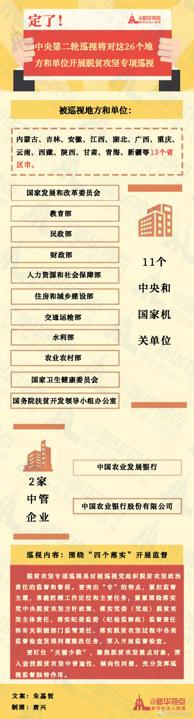 經(jīng)黨中央批準(zhǔn),十九屆中央第二輪巡視將對(duì)內(nèi)蒙古、吉林、安徽、江西、湖北、廣西、重慶、云南、西藏、陜西、甘肅、青海、新疆、國(guó)家發(fā)展和改革委員會(huì)、教育部、民政部、財(cái)政部、人力資源和社會(huì)保障部、住房和城鄉(xiāng)建設(shè)部、交通運(yùn)輸部、水利部、農(nóng)業(yè)農(nóng)村部、國(guó)家衛(wèi)生健康委員會(huì)、國(guó)務(wù)院扶貧開發(fā)領(lǐng)導(dǎo)小組辦公室、中國(guó)農(nóng)業(yè)發(fā)展銀行、中國(guó)農(nóng)業(yè)銀行股份有限公司等26個(gè)地方、單位黨組織開展脫貧攻堅(jiān)專項(xiàng)巡視。
