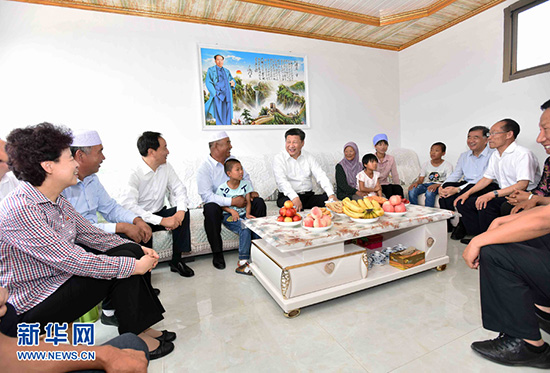 2016年7月18日至20日,中共中央總書記、國家主席、中央軍委主席習(xí)近平在寧夏調(diào)研考察。這是7月19日上午,習(xí)近平在銀川市永寧縣閩寧鎮(zhèn)原隆移民村回族移民群眾海國寶家中看望。新華社記者李濤攝