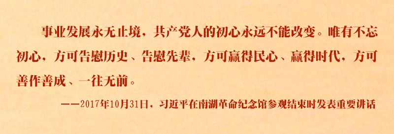 2017年10月31日,習(xí)近平帶領(lǐng)新一屆中央政治局常委瞻仰黨的一大會(huì)址和浙江嘉興南湖紅船,回顧建黨歷史,重溫入黨誓詞,宣示新一屆黨中央領(lǐng)導(dǎo)集體的堅(jiān)定政治信念。初心之旅一年間,習(xí)近平多次提到共產(chǎn)黨人的初心,號(hào)召?gòu)V大黨員干部不忘初心、牢記使命、永遠(yuǎn)奮斗。