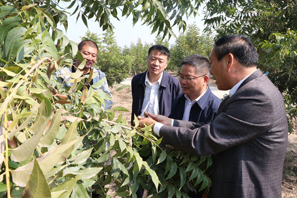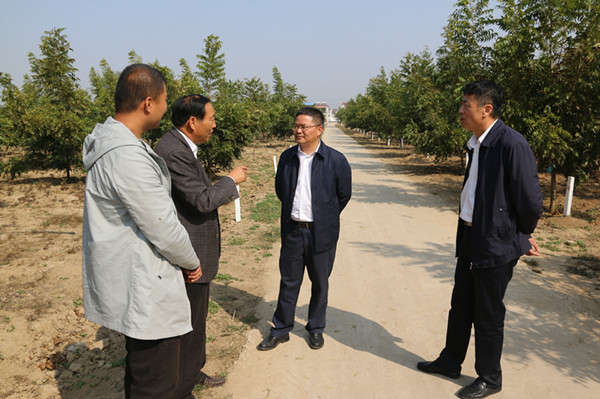 阜陽大豐收專業(yè)合作社是葛橋村產(chǎn)業(yè)扶貧基地,目前種植薄殼山核桃1268畝、林下經(jīng)濟(jì)作物800畝,發(fā)展水產(chǎn)養(yǎng)殖78畝。貧困戶通過土地入股、金融入股、務(wù)工就業(yè)三種方式參與合作社發(fā)展,合作社按照“三個三分之一”進(jìn)行利潤分配:利潤的三分之一用于擴(kuò)大再生產(chǎn),三分之一歸社員,三分之一作為互助保障基金,已帶動貧困戶304戶,每戶每年增收5000元以上。虞建斌一行走進(jìn)合作社薄殼山核桃“林經(jīng)套種”基地,詳細(xì)了解種植規(guī)模、經(jīng)濟(jì)效益、帶動貧困戶增收等情況,并就產(chǎn)業(yè)發(fā)展、扶貧長效帶動機(jī)制建設(shè)等事宜提出指導(dǎo)性意見和建議。