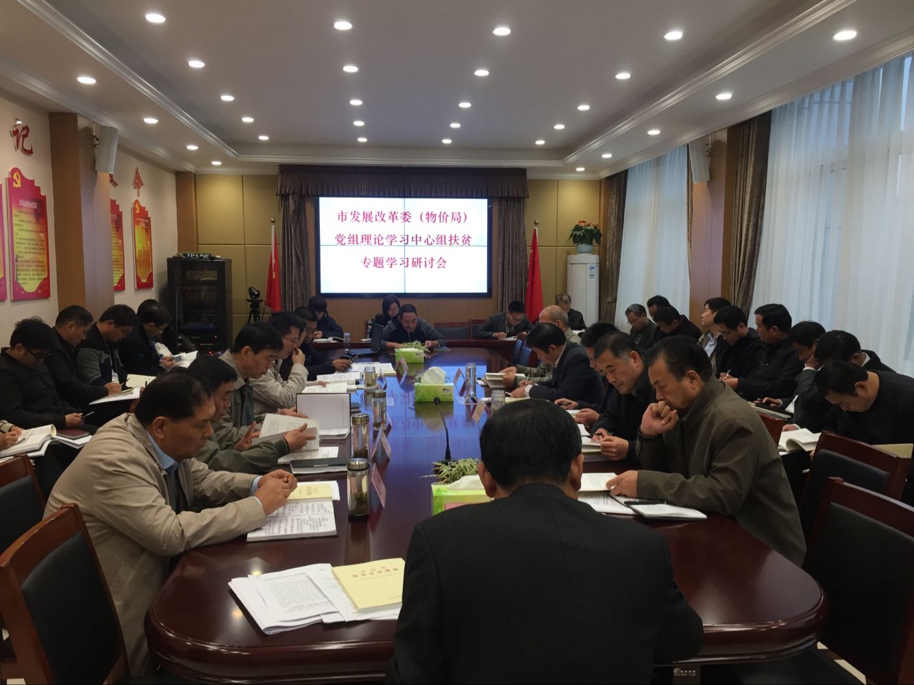 11月7日下午,市發(fā)展改革委(市物價局)召開黨組(擴大)理論學(xué)習(xí)中心組扶貧專題學(xué)習(xí)研討會,縣處級干部、各科室及委屬機構(gòu)負責(zé)人參加會議,黨組書記、主任王家仁主持會議并講話。