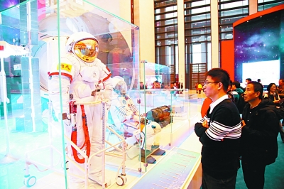 “可上九天攬?jiān)?,可下五洋捉鱉”。一邊是航天技術(shù)展區(qū),一邊是航海技術(shù)展區(qū),完美對(duì)應(yīng)著詩(shī)句,一上一下,延展著人類(lèi)對(duì)于世界的認(rèn)知和想象。天宮二號(hào)空間實(shí)驗(yàn)室、嫦娥三號(hào)月球探測(cè)器以及蛟龍、海龍、潛龍“三龍兄弟”深海探測(cè)裝備模型,讓很多在場(chǎng)的孩子發(fā)出贊嘆之聲。