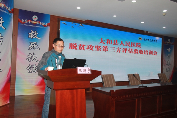 根據(jù)全縣脫貧“摘帽”整體部署和健康脫貧“冬季攻勢(shì)”實(shí)施方案,12月1日,太和縣人民醫(yī)院邀請(qǐng)?zhí)涂h扶貧辦副主任汪新宇作2018年脫貧攻堅(jiān)第三方評(píng)估驗(yàn)收專題培訓(xùn)。全院扶貧幫扶人員參加,黨委委員樊少華主持。
