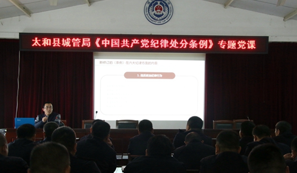 為深入學(xué)習(xí)領(lǐng)會(huì)新修訂的《中國(guó)共產(chǎn)黨紀(jì)律處分條例》,引導(dǎo)廣大黨員干部進(jìn)一步強(qiáng)化紀(jì)律和規(guī)矩意識(shí),12月3日上午,太和縣城管局組織學(xué)習(xí)貫徹《中國(guó)共產(chǎn)黨紀(jì)律處分條例》專題黨課在縣城管局四樓會(huì)議室舉行。會(huì)議由縣城管局局長(zhǎng)劉志主持,縣委黨校老師王朗以解讀學(xué)習(xí)新修訂的《中國(guó)共產(chǎn)黨紀(jì)律處分條例》為題進(jìn)行授課。