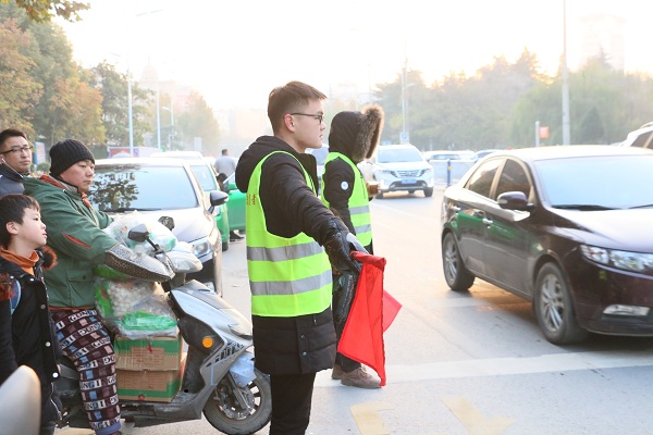 來自阜陽義工聯(lián)合會、潁淮公益志愿者協(xié)會、阜陽市關(guān)愛“三留守”志愿者協(xié)會的志愿者以及來自阜陽市幸福里餐飲有限公司和安徽天筑建設(shè)(集團(tuán))的員工,給在寒冷中堅(jiān)守崗位的青年志愿者和交警送去了熱飲和早餐,并囑咐他們在維護(hù)交通秩序的同時(shí)也要注意安全。