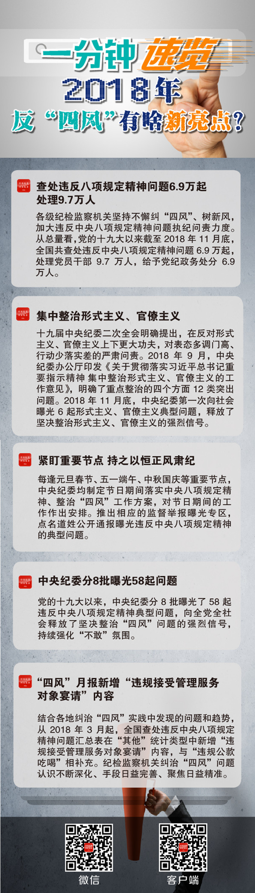 黨的十九大以來(lái),中央紀(jì)委分8批曝光了58起違反中央八項(xiàng)規(guī)定精神典型問(wèn)題,持續(xù)點(diǎn)名道姓通報(bào)曝光,在全國(guó)范圍內(nèi)形成了“四風(fēng)”露頭、人人喊打的氛圍。