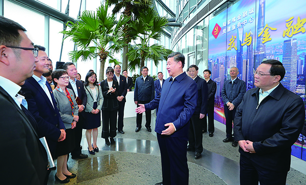 2018年11月6日至7日,中共中央總書記、國家主席、中央軍委主席習(xí)近平在上??疾?。這是6日上午,習(xí)近平在上海中心大廈22層的陸家嘴金融城黨建服務(wù)中心,同正在聯(lián)合開展主題黨日活動的企業(yè)黨員親切交談。新華社記者 謝環(huán)馳/攝