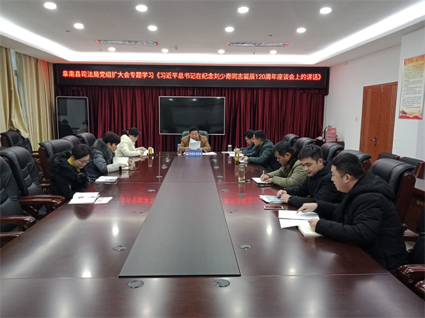 1月17日下午,阜南縣司法局召開黨組擴(kuò)大會(huì),專題學(xué)習(xí)《習(xí)近平總書記在紀(jì)念劉少奇同志誕辰120周年座談會(huì)上的講話》,會(huì)議由局黨組書記、局長(zhǎng)丁傳珠主持,局黨組班子成員、各股室負(fù)責(zé)人參加會(huì)議。