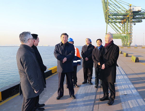 1月16日至18日,中共中央總書(shū)記、國(guó)家主席、中央軍委主席習(xí)近平在京津冀考察,主持召開(kāi)京津冀協(xié)同發(fā)展座談會(huì)并發(fā)表重要講話。這是1月17日下午,習(xí)近平在天津港碼頭考察。新華社記者 鞠鵬 攝