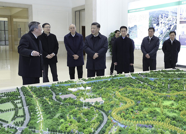 18日上午,習(xí)近平乘車前往北京城市副中心,并沿途察看“城市綠心”植樹(shù)造林地塊。在市委辦公樓主樓,習(xí)近平通過(guò)設(shè)計(jì)模型和展板,詳細(xì)了解副中心重大工程項(xiàng)目規(guī)劃建設(shè)情況。習(xí)近平強(qiáng)調(diào),建設(shè)北京城市副中心要堅(jiān)持規(guī)劃先行、質(zhì)量第一。要把公共建筑與山水自然融為一體,科學(xué)布局生產(chǎn)、生活、生態(tài)空間,使工作、居住、休閑、交通、教育、醫(yī)療等有機(jī)銜接、便利快捷。要把規(guī)劃執(zhí)行好、落實(shí)好,把藍(lán)圖變?yōu)閷?shí)景,使北京城市副中心成為這座千年古都又一張靚麗的城市名片。