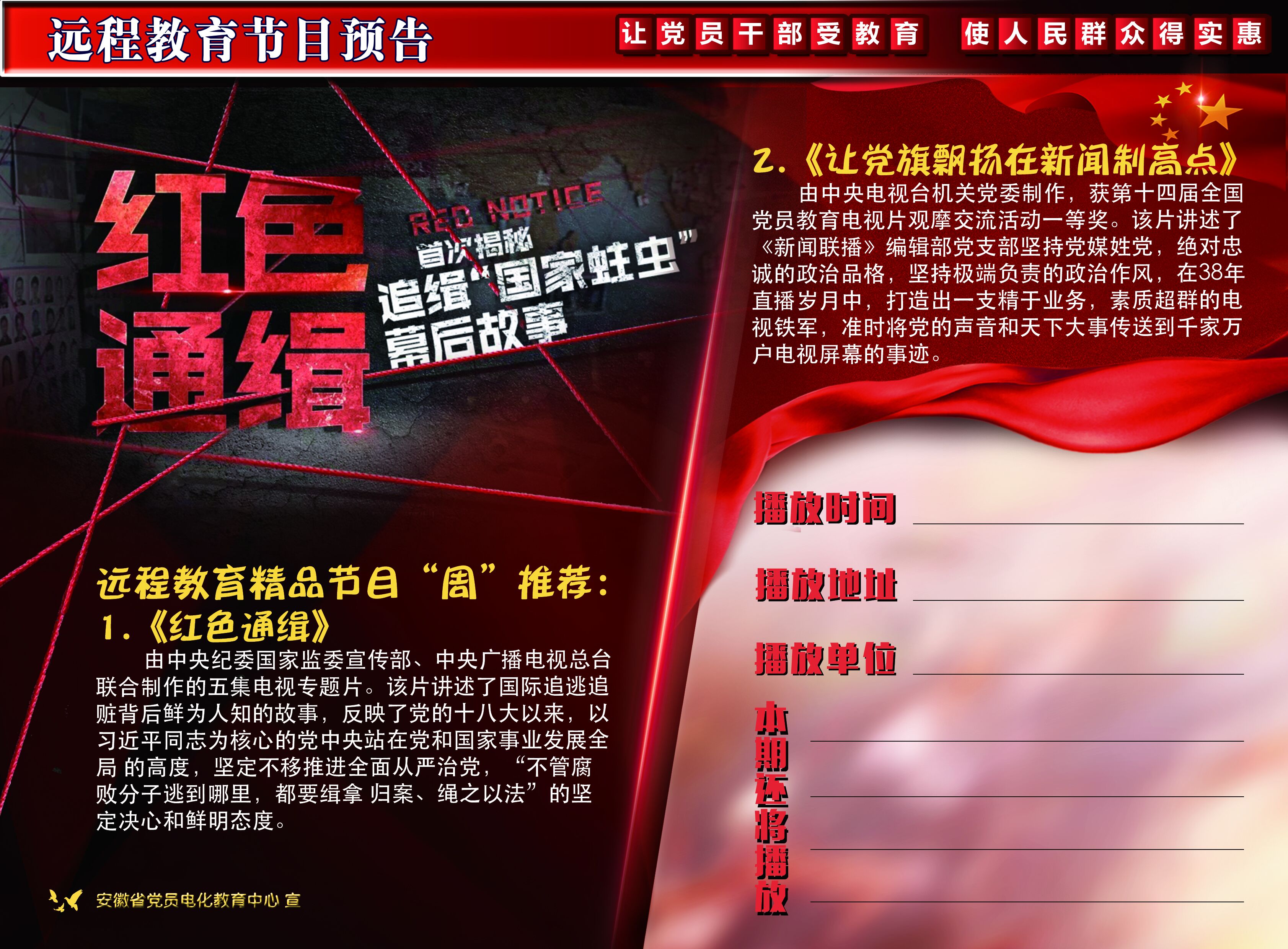 以上節(jié)目請(qǐng)通過(guò)遠(yuǎn)程教育終端站點(diǎn)或安徽先鋒網(wǎng)-共產(chǎn)黨員網(wǎng)絡(luò)電視臺(tái)點(diǎn)播收看。