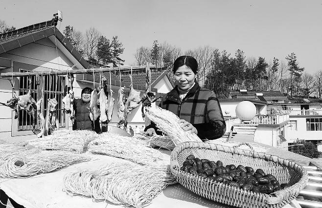 1月22日,在金寨縣古碑鎮(zhèn)七鄰村新農(nóng)村居民點,易地搬遷入住新居的村民忙著在樓頂晾曬粉絲、紅棗和臘肉等年貨。近年來,該縣大力推進(jìn)產(chǎn)業(yè)扶貧和易地扶貧搬遷,大山里的鄉(xiāng)親們安居樂業(yè),日子過得越來越紅火。本報記者 許昊 本報通訊員 岳陽 攝