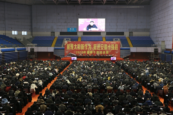 2月11日上午,阜陽市太和縣2019年“展現(xiàn)太和新作為 挺進安徽十強縣”專題培訓班在縣體育館舉行開班儀式。全縣公務員和縣直履行政府職能的事業(yè)單位主要負責人近1800人參加培訓。縣委書記楊波作動員講話??h委副書記、縣長劉牧愚主持開班儀式??h領導齊安民、楊代軍、潘江徽、劉健、鮑黎、孫秀劍、丁志凱、海治國、于群、汪斌等出席開班儀式。