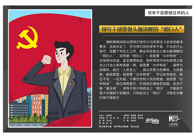 旗幟鮮明講政治是我們黨作為馬克思主義政黨的根本要求。這就決定了,作為我們黨的領(lǐng)導干部,不論在什么地方、在哪個崗位上工作,都必須在政治上做頭腦清醒的“明白人”。如何做“明白人”?就是要“心中有黨”,對黨絕對忠誠,堅定理想信念,始終同黨中央在思想上政治上行動上保持高度一致;就是要“心中有民”,涵養(yǎng)為民情懷,踐行“人民至上”,真心實意為民解憂、為民解困、助民致富;就是要“心中有責”,牢記職責使命,鼓足干勁、一往無前,不辜負黨和人民的希望;就是要“心中有戒”,樹立規(guī)矩意識,時刻把紀律挺在前面,堅決不碰“高壓線”。領(lǐng)導干部只有政治上“明白”,才能在大是大非面前不犯糊涂;只有政治上“明白”,才能在關(guān)鍵時刻不掉鏈子。(馬若虎)