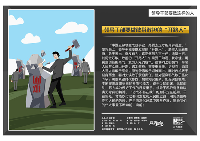 “事要去做才能成就事業(yè),路要去走才能開辟通途?!睆团d路上,領(lǐng)導干部要做發(fā)展的“開路人”,順應人民新期待,勇于擔當、奮發(fā)有為,真正做到為官一任,造福一方。如何做好敢拼敢擔的“開路人”?需要干勁足、狀態(tài)佳,用銳意創(chuàng)新的勇氣、敢為人先的銳氣、蓬勃向上的朝氣,帶領(lǐng)人民群眾逢山開路,遇水架橋;需要重責任、講擔當,面對大是大非敢于亮劍,面對矛盾敢于迎難而上,面對危機敢于挺身而出,面對失誤敢于承擔責任,面對歪風邪氣敢于堅決斗爭;需要緊跟時代步伐,加快知識更新、加強實踐鍛煉,不斷提高履職盡責的素質(zhì)和能力,避免少知而迷、無知而亂,努力成為做好工作的行家里手。領(lǐng)導干部只有堅持以責無旁貸的精神、“功成不必在我”的胸懷走在前列、干在實處,才能以行動書寫對黨和人民的忠誠,用實績贏得黨和人民的信賴,在全面深化改革中攻堅克難,推動我們的偉大事業(yè)不斷向前,向前?。ㄐ炜桑?/span>