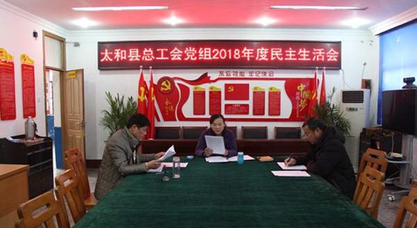 2月23日下午,太和縣總工會黨組召開2018年度民主生活會。會議由縣總工會黨組書記、副主席劉靜同志主持,全體黨組成員參加會議。