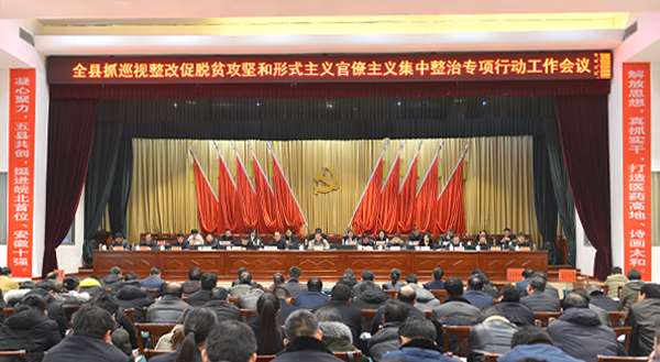 2月22日,太和縣在縣委禮堂召開抓巡視整改促脫貧攻堅和形式主義官僚主義整治專項行動工作會議,縣領導楊波、齊安民、楊代軍、潘江徽、劉健、鮑黎、孫秀劍、丁志凱、海治國、于群、丁強、汪斌等出席會議,縣委副書記、政法委書記潘江徽主持會議。