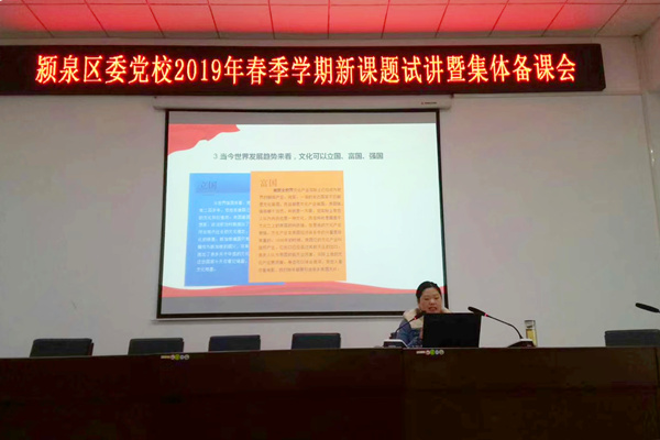 為了強(qiáng)化對(duì)習(xí)近平習(xí)近平新時(shí)代中國(guó)特色社會(huì)主義思想的教學(xué)研究,3月1日,潁泉區(qū)委黨校舉辦2019年春季學(xué)期新課題試講,組織教師分專題分領(lǐng)域開展習(xí)近平習(xí)近平新時(shí)代中國(guó)特色社會(huì)主義思想理論攻關(guān),進(jìn)行集體備課,著力提高教師用學(xué)術(shù)講政治的水平。