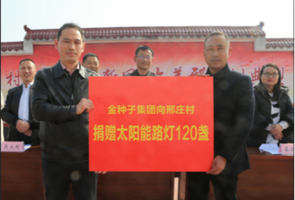 活動(dòng)現(xiàn)場(chǎng)還舉行了捐贈(zèng)儀式。為進(jìn)一步推進(jìn)美麗鄉(xiāng)村建設(shè),金種子集團(tuán)黨委會(huì)、董事會(huì)、監(jiān)事會(huì)、經(jīng)理層等領(lǐng)導(dǎo)班子成員個(gè)人捐資,向邢莊村捐贈(zèng)太陽能路燈120盞,讓村民徹底告別“摸黑走夜路”的歷史。當(dāng)主持人宣布這一消息時(shí),全場(chǎng)村民響起熱烈的掌聲,一些村民激動(dòng)地大喊“太好了,謝謝!”