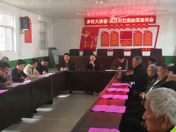 徐彪首先宣讀了中共中央、國務(wù)院《關(guān)于開展掃黑除惡專項斗爭的通知》,傳達了2019年市委政府工作會議精神,王志倫通過鄉(xiāng)村大課堂給吳莊村全體黨員和部分群眾代表上了一節(jié)生動形象的掃黑除惡專題教育課。