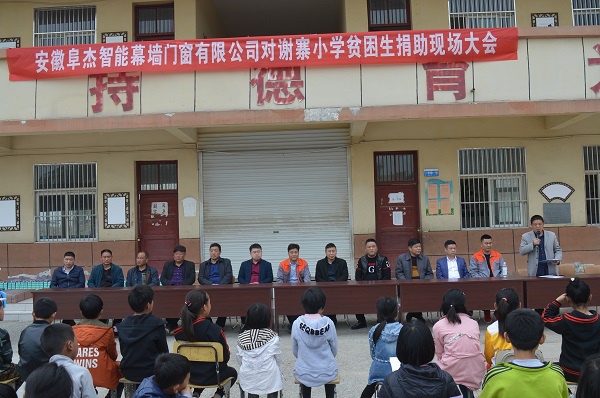 捐贈儀式上,安徽阜杰智能幕墻門窗有限公司為每名貧困學生發(fā)放了一個書包、一套學習文具、一張學習書桌,并現(xiàn)場贈予謝寨學校幫扶資金2萬元,用于貧困學生的幫扶和激勵獎勵。常征表示,脫貧攻堅不僅是黨和國家的責任,民營企業(yè)同樣也擔負著共同發(fā)展的社會責任,扶貧濟困責無旁貸。謝法紅說,作為方集人,能夠為家鄉(xiāng)的脫貧攻堅貢獻力量,感到非常的榮幸,今后會繼續(xù)開展幫扶活動。方集鎮(zhèn)黨委副書記孫傳忠代表鎮(zhèn)黨委、政府和受助貧困學生對安徽阜杰智能幕墻門窗有限公司的慷慨捐贈表示感謝。