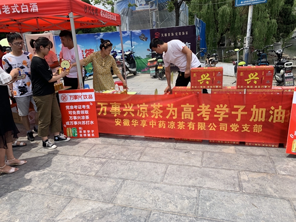 6月7日至8日,高考恰逢端午節(jié),安徽華享中藥涼茶有限公司黨支部積極組織開展“愛心助考送清涼,助夢(mèng)遠(yuǎn)航獻(xiàn)愛心”服務(wù)活動(dòng),赴全縣多家考點(diǎn),為考生和家長(zhǎng)免費(fèi)供應(yīng)涼茶降暑,并為考生免費(fèi)提供送考車志愿服務(wù)隊(duì)。