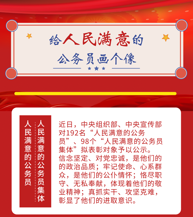 近日,中央組織部、中央宣傳部對192名“人民滿意的公務(wù)員”、98個“人民滿意的公務(wù)員集體”擬表彰對象予以公示。通過選樹典型、弘揚正氣,進一步提升公務(wù)員的職業(yè)榮譽感,充分展示公務(wù)員對人民負責(zé)、為人民服務(wù)、讓人民滿意的時代風(fēng)采和公仆本色,有效激勵廣大公務(wù)員在新時代展現(xiàn)新?lián)斝伦鳛椤?/span>