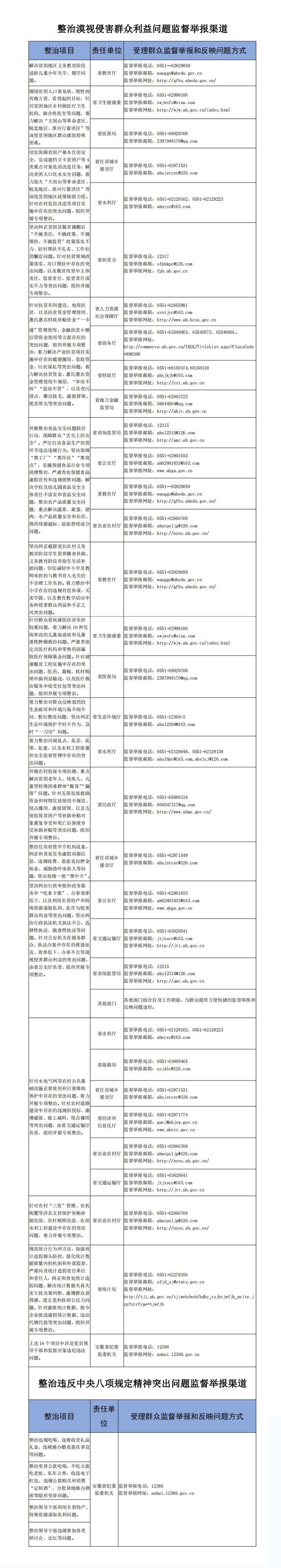 按照省委“不忘初心、牢記使命”主題教育專項整治工作要求,省紀委監(jiān)委機關牽頭開展漠視侵害群眾利益問題專項整治工作,圍繞聚焦扶貧領域腐敗和作風問題,聚焦教育醫(yī)療、環(huán)境保護、食品藥品安全等民生領域侵害群眾利益問題,聚焦發(fā)生在群眾身邊的不正之風和“微腐敗”問題,聚焦統(tǒng)計造假問題,著力解決群眾最關心最直接最現實的利益問題。同時,對違反中央八項規(guī)定精神的突出問題開展專項整治。為方便群眾參與監(jiān)督和反映問題,做好開門抓整治工作,現將專項整治受理群眾監(jiān)督舉報和反映問題方式公布如下。